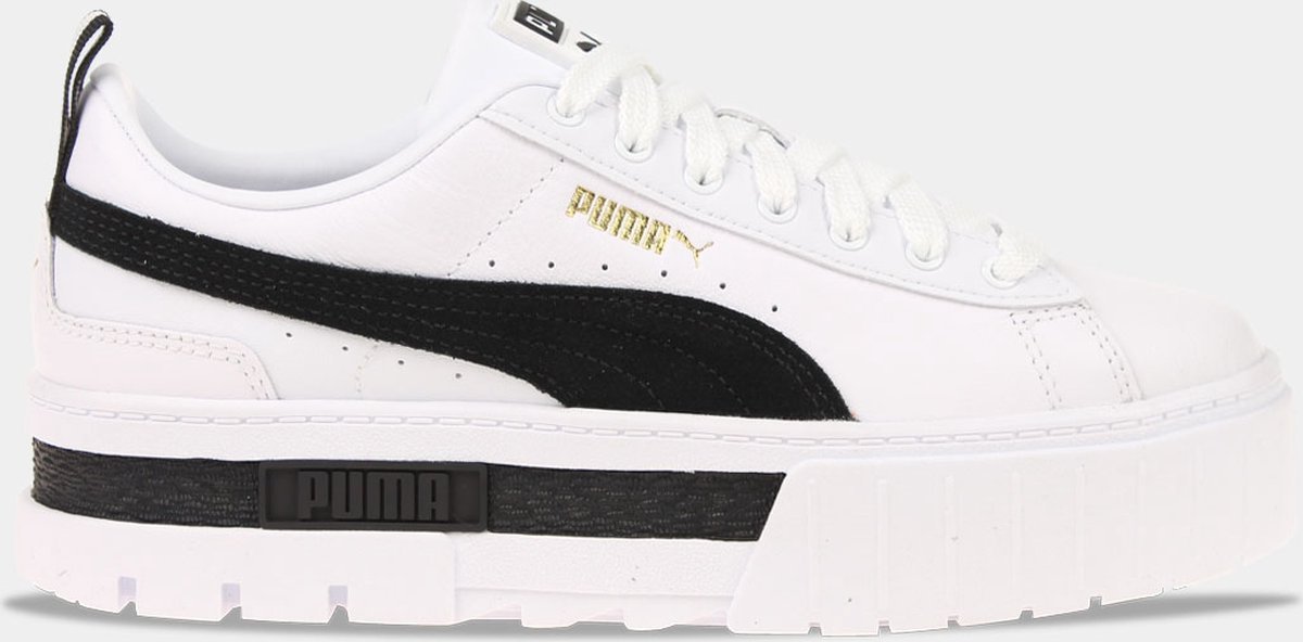 Maak kennis met deze lage sneaker Mayze LTH WN met plateauzool van het merk Puma. Deze statement sneaker heeft een cool design van wit leer met suède panelen en de herkenbare Puma-formstrip in het zwart suède en goud merk reliëf op de zijkant. De hiel heeft een handige textiele aantrek lus waardoor je ‘m gemakkelijk aan trekt en is fraai afgewerkt met een extra versteviging op de hielcap en gouden folie-opdruk van het cat logo. De tong is gesierd met een groot rubberen label met reliëf opdruk. De schoen is gevoerd met lederlook materiaal en textiel, met een dempende uitneembaar voetbed die superzacht en comfortabel aan voelt. De oversized plateau zool is sky high dankzij de dikte van bijna 4,5 centimeter en ziet er ook nog eens super toff uit door de diepe groeven en de zwarte rand met reliëf merk opdruk die écht in het oog springt. De zool heeft een gripvaste profiel die je helpt slippen en uitglijden te voorkomen. Combineer ‘m onder een coole jurk of toffe jeans met de pijpen iets opgerold, zodat jouw Puma’s lekker opvallen!